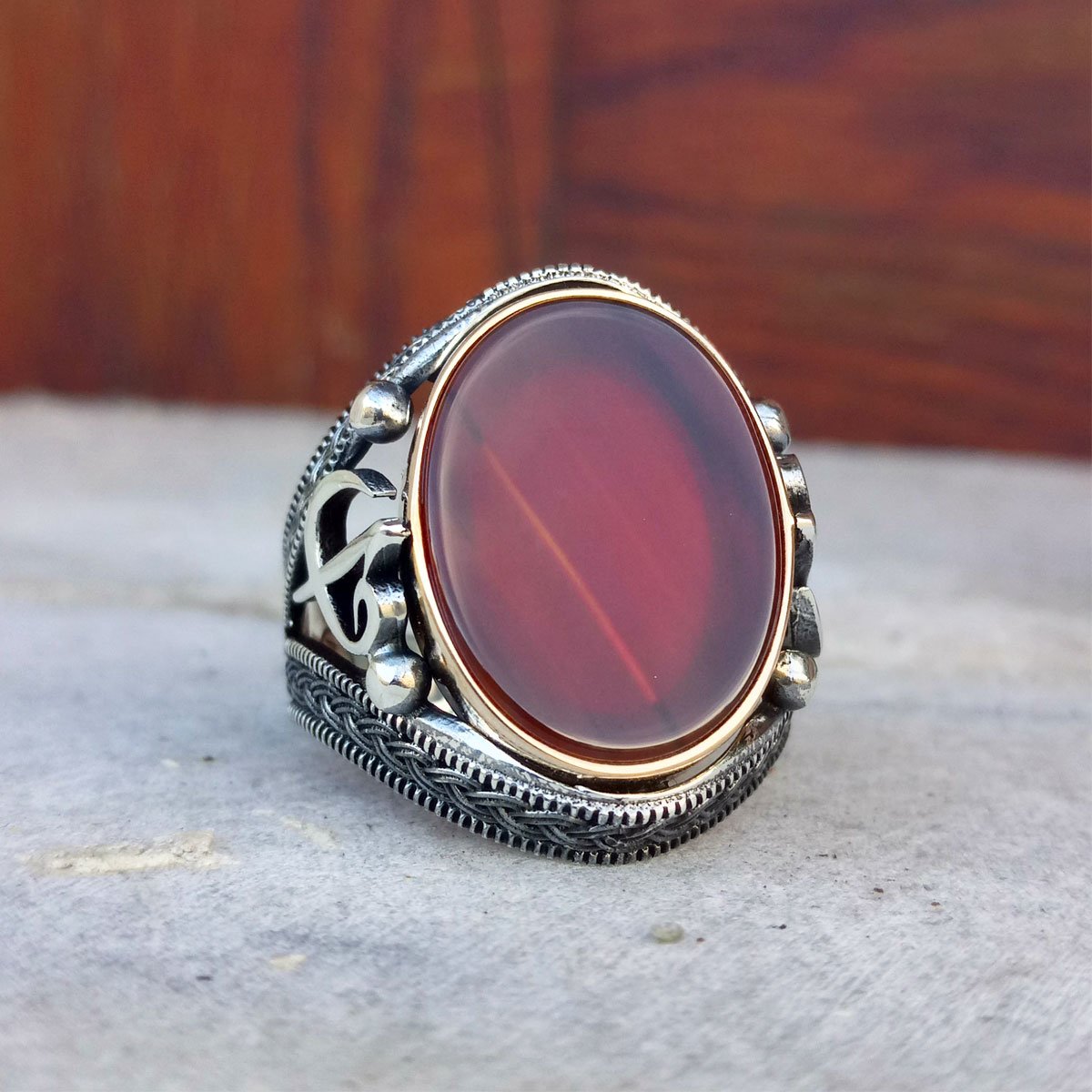 925 Ayar Gümüş Akik Taşlı Elif Vav Erkek Yüzük