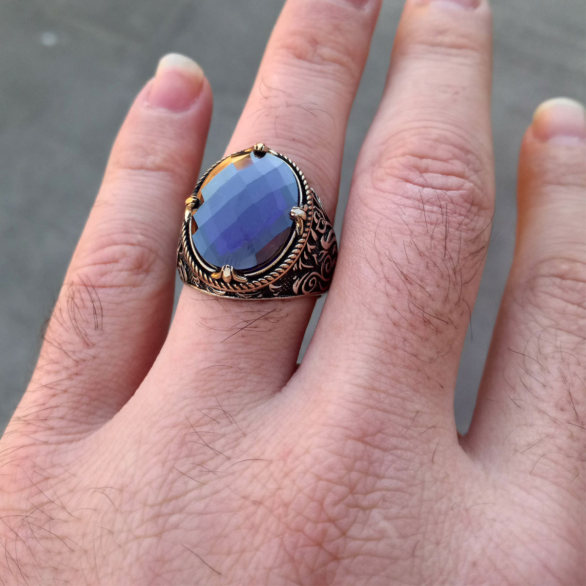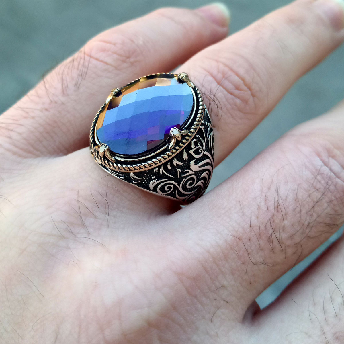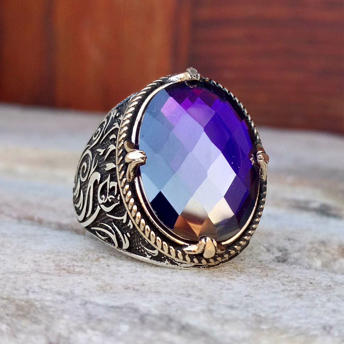 925 Ayar Gümüş Ametist Taşlı Lale Motifli Erkek Yüzük