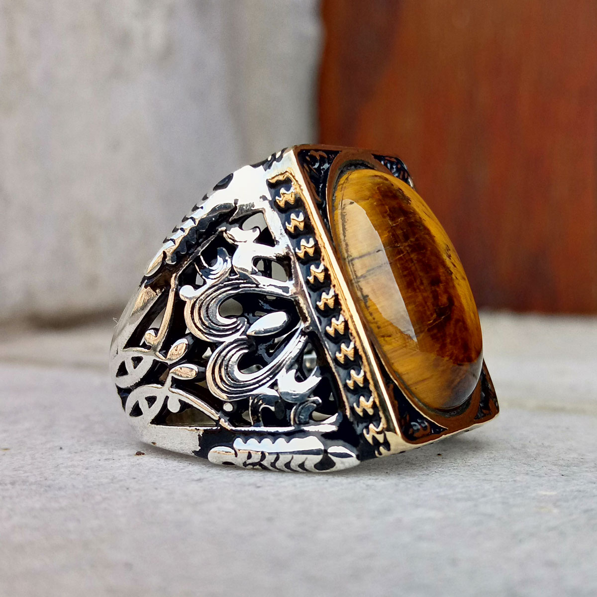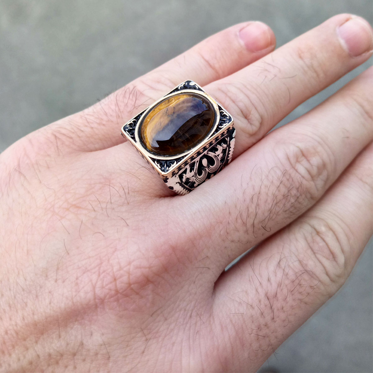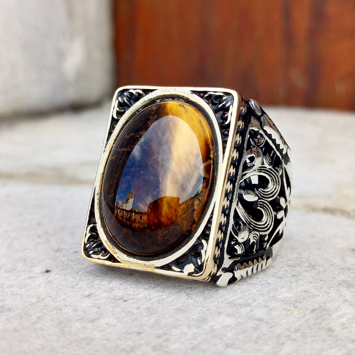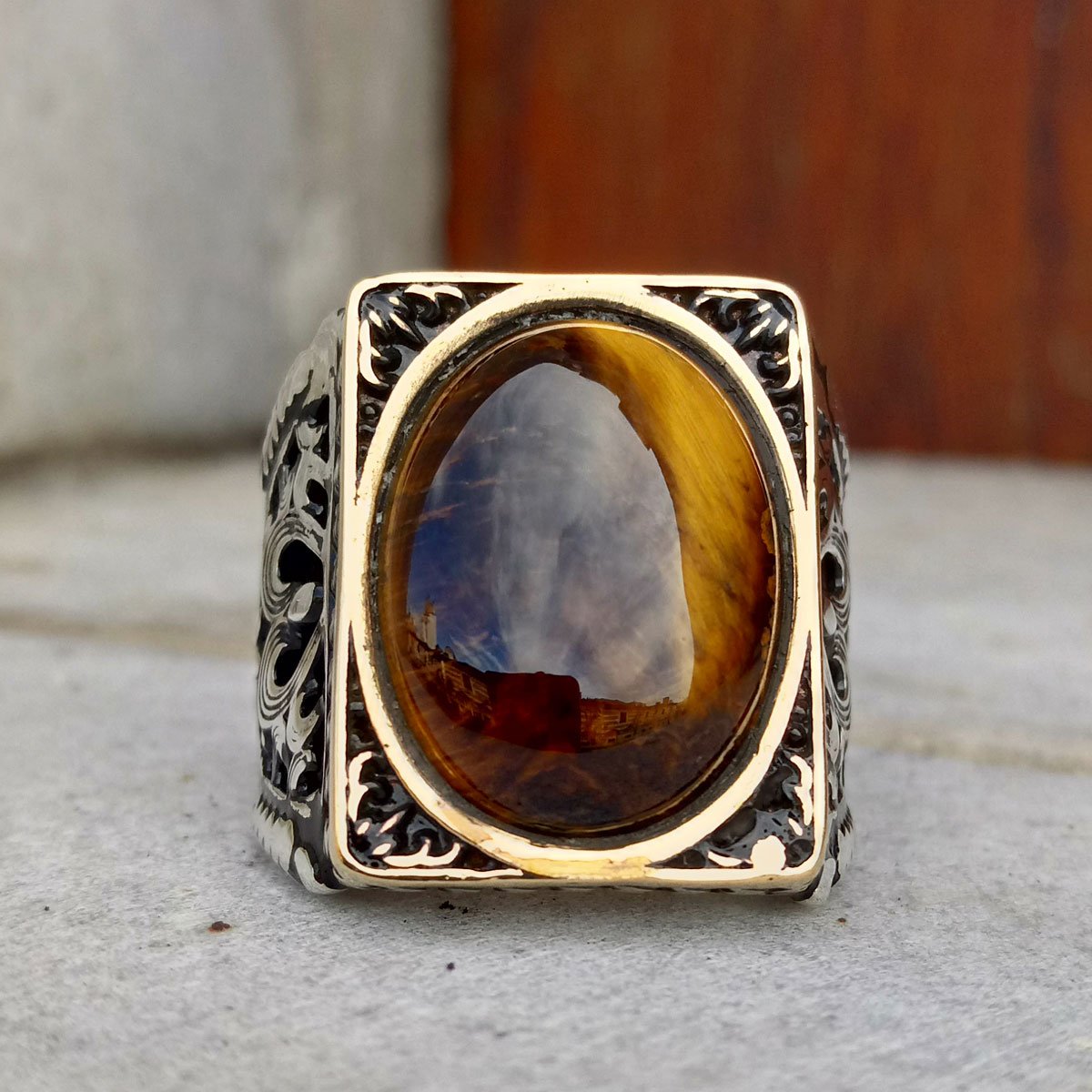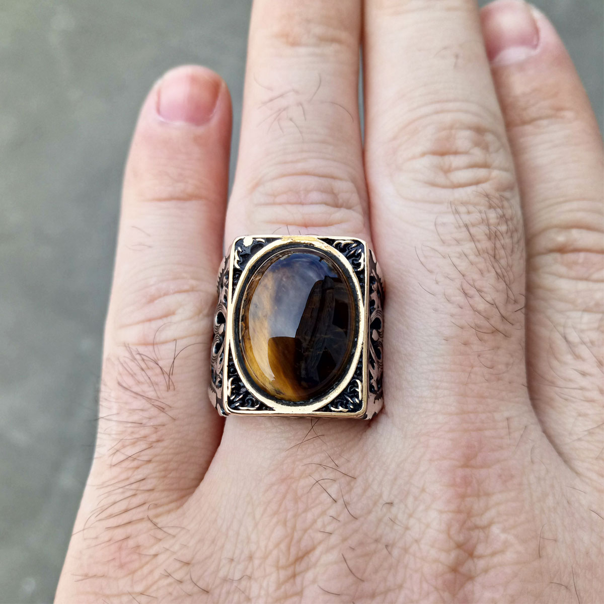 925 Ayar Gümüş Kaplan Gözü Taşlı Erkek Yüzük