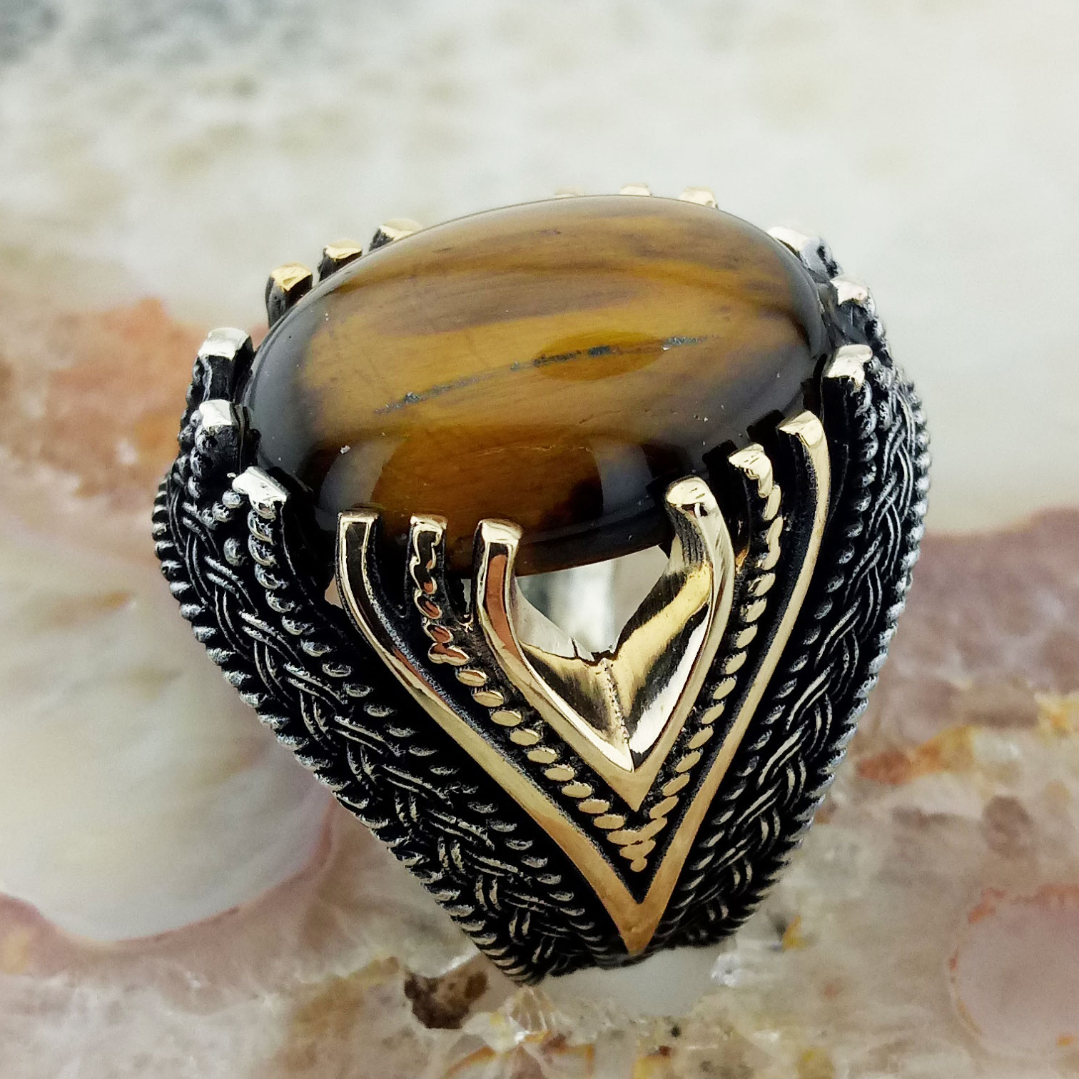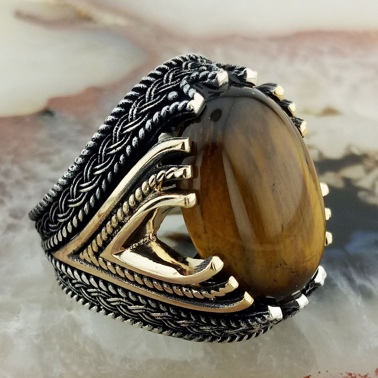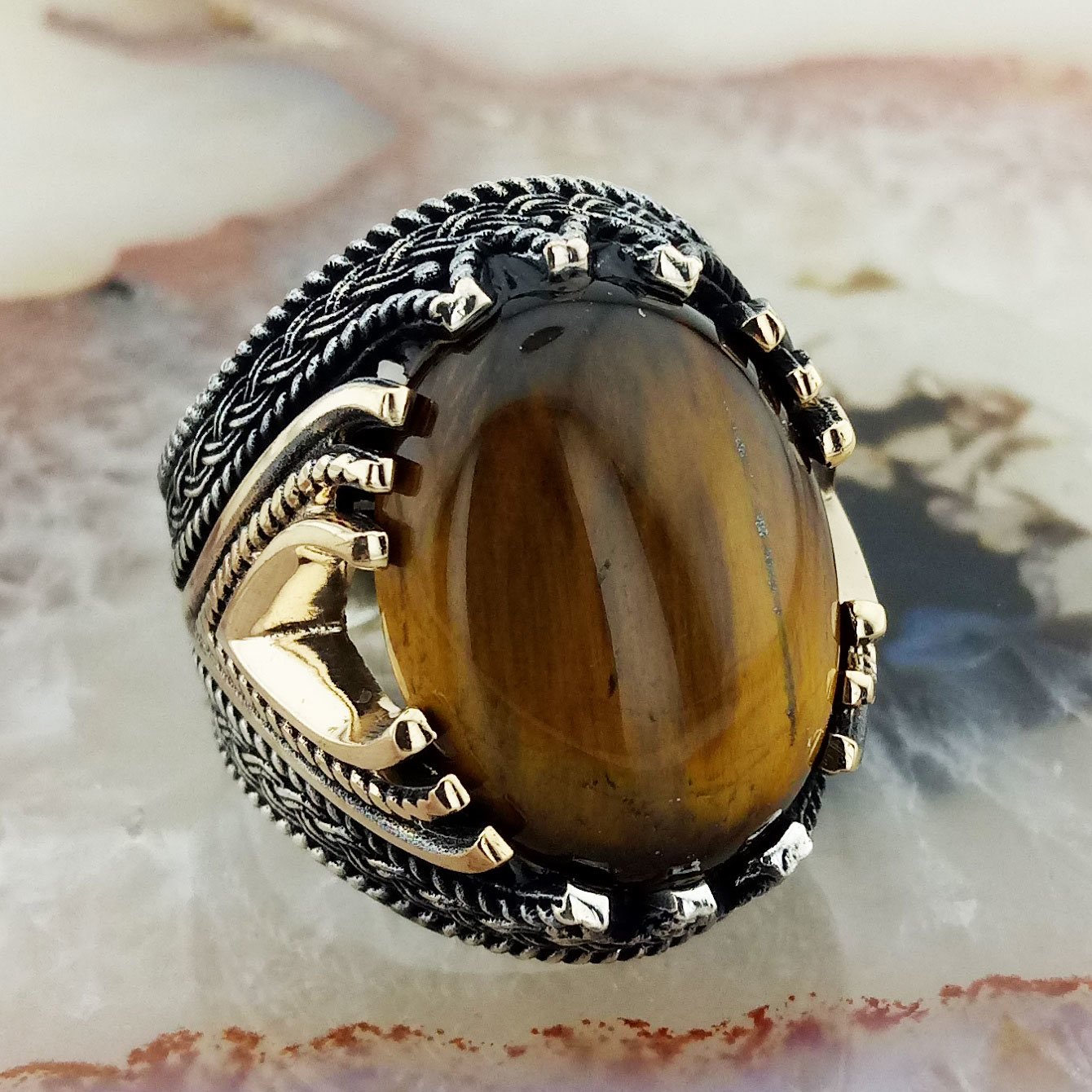 925 Ayar Gümüş Kaplan Gözü Taşlı Kartal Erkek Yüzük