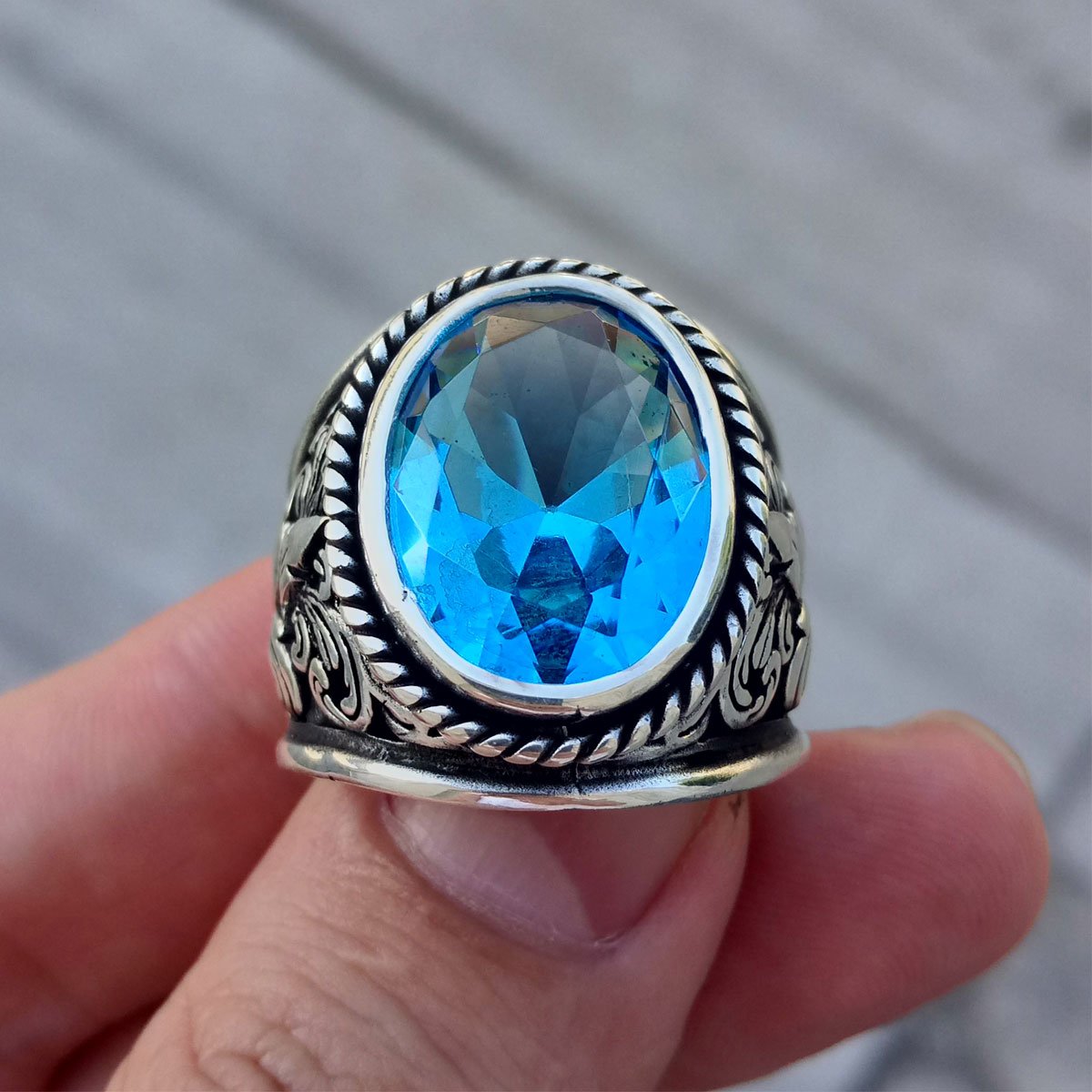 925 Ayar Gümüş Mavi Topaz Yaprak Motif İşlemeli Erkek Yüzük
