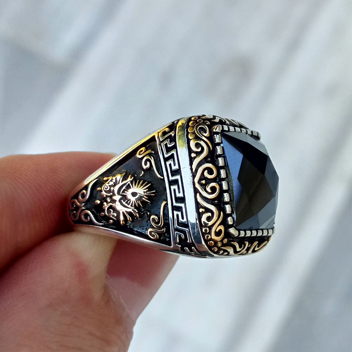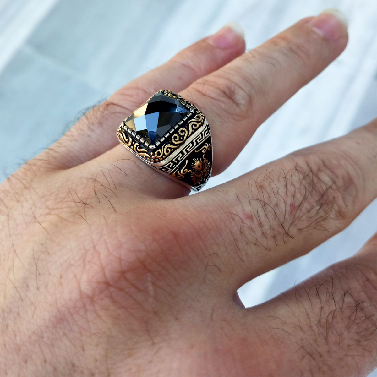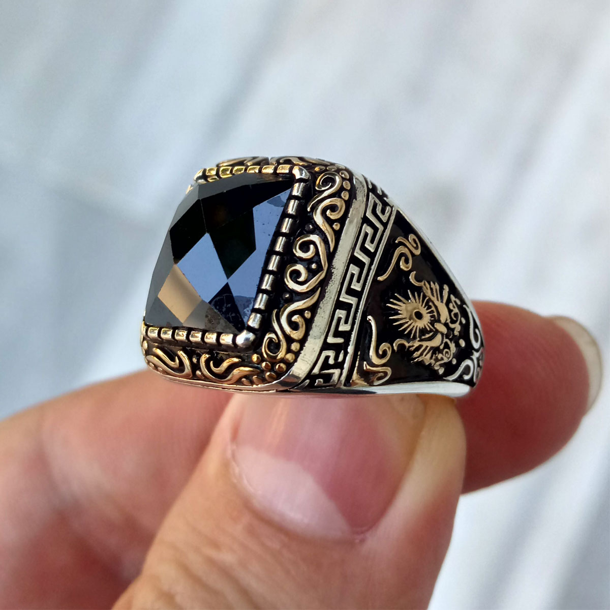 925 Ayar Gümüş Siyah Taşlı Osmanlı Arması Erkek Yüzük