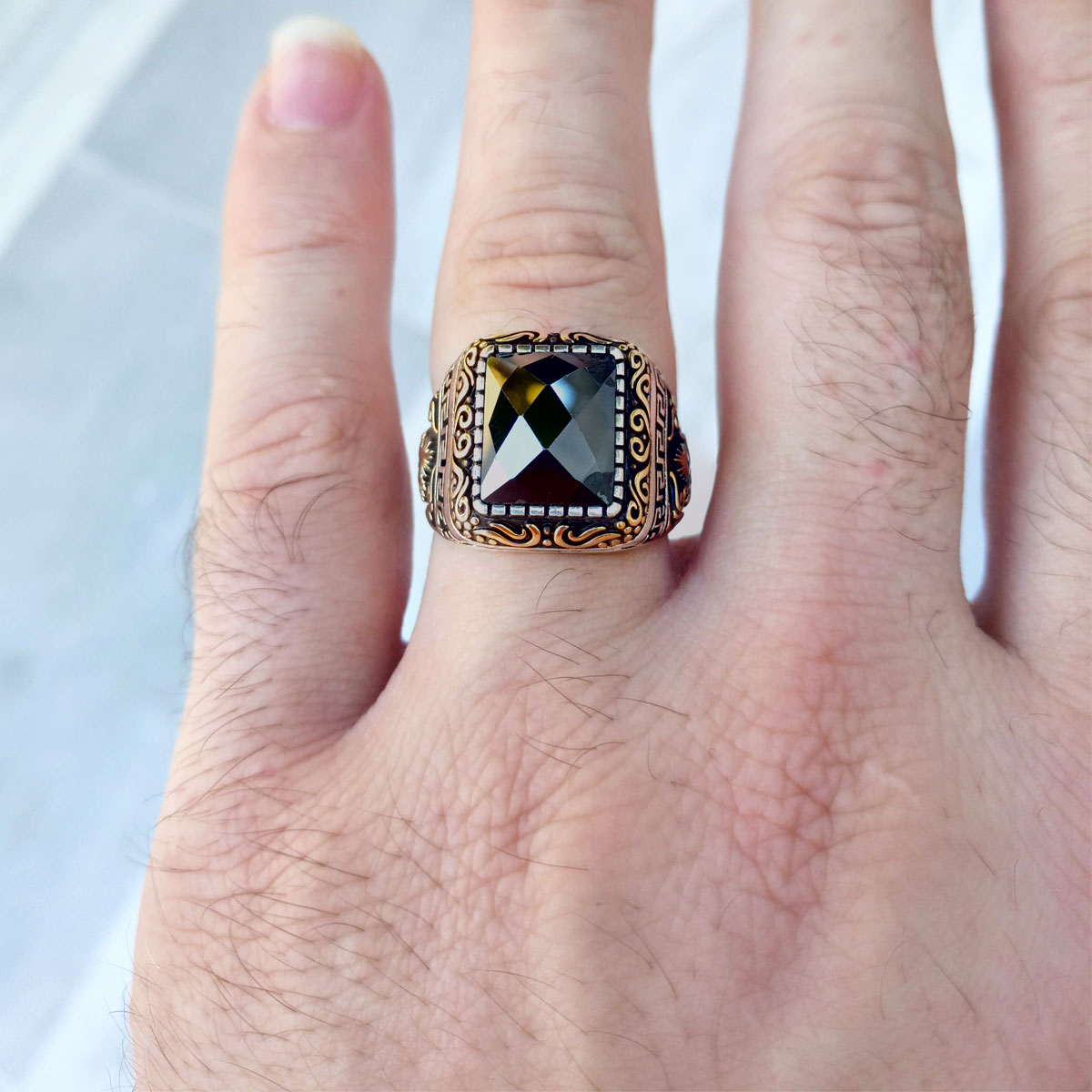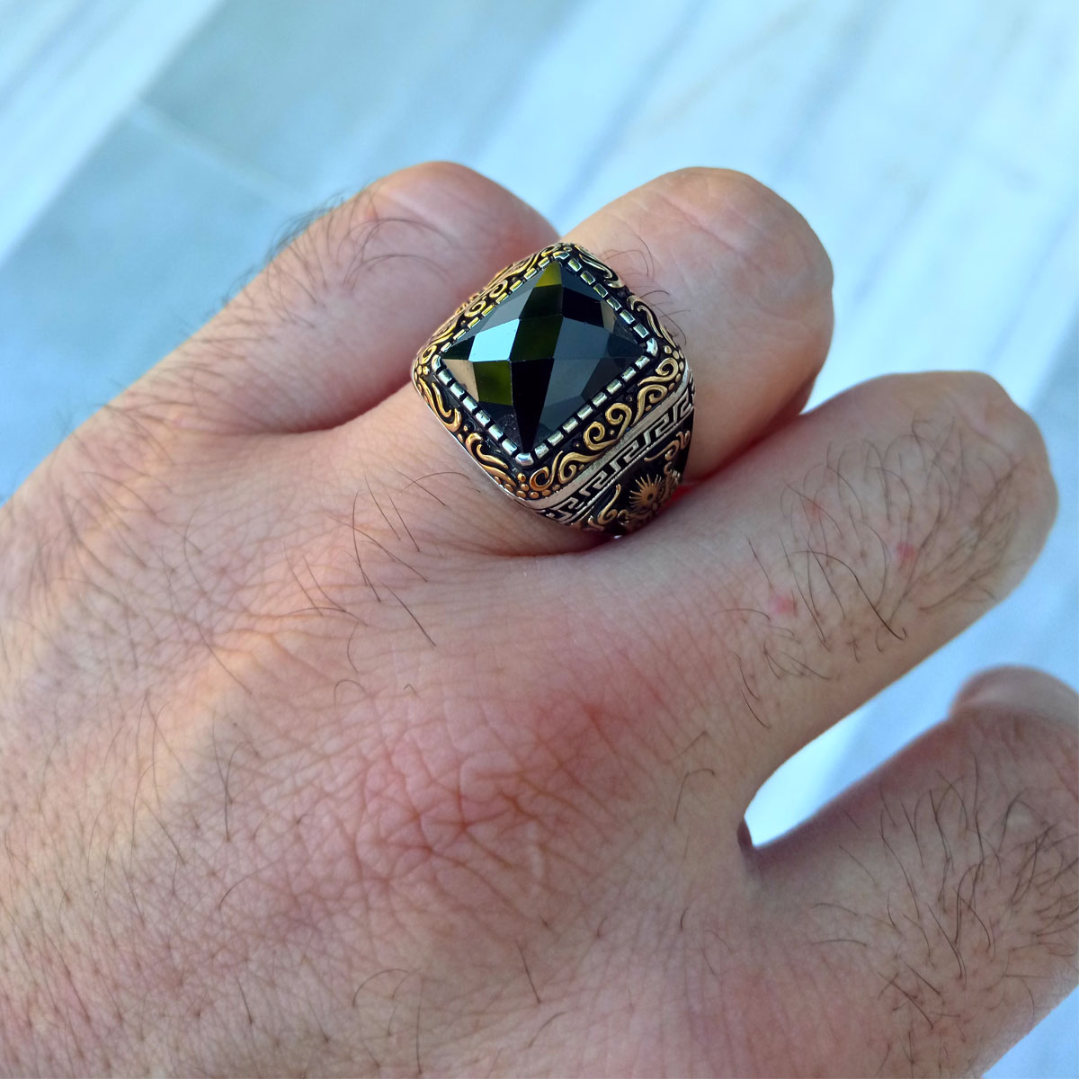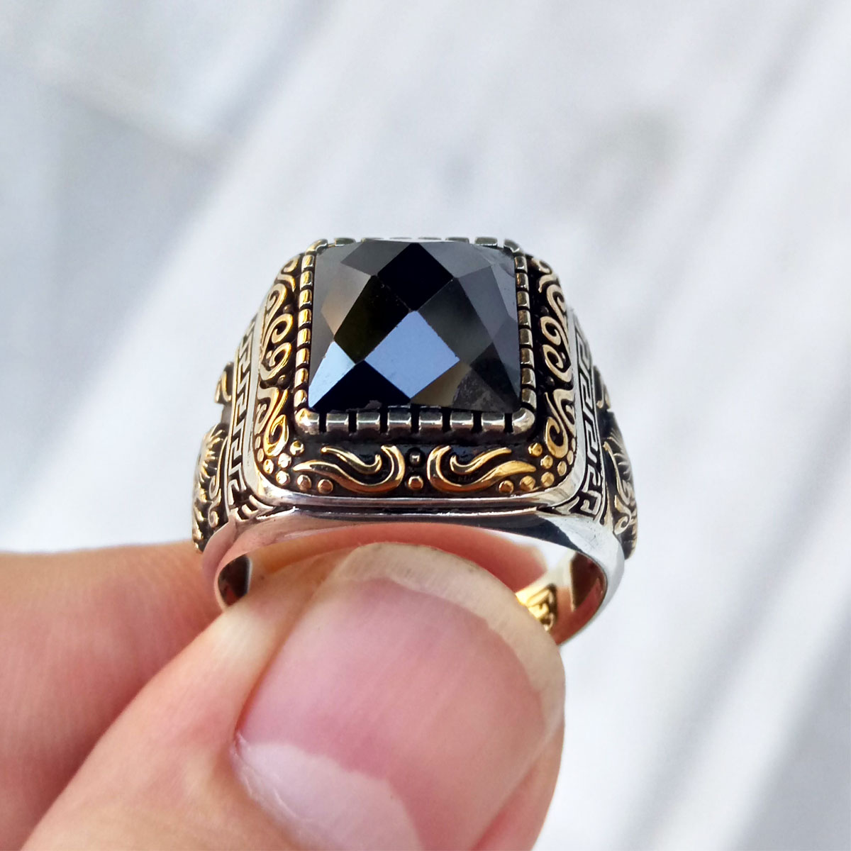 925 Ayar Gümüş Siyah Taşlı Osmanlı Arması Erkek Yüzük