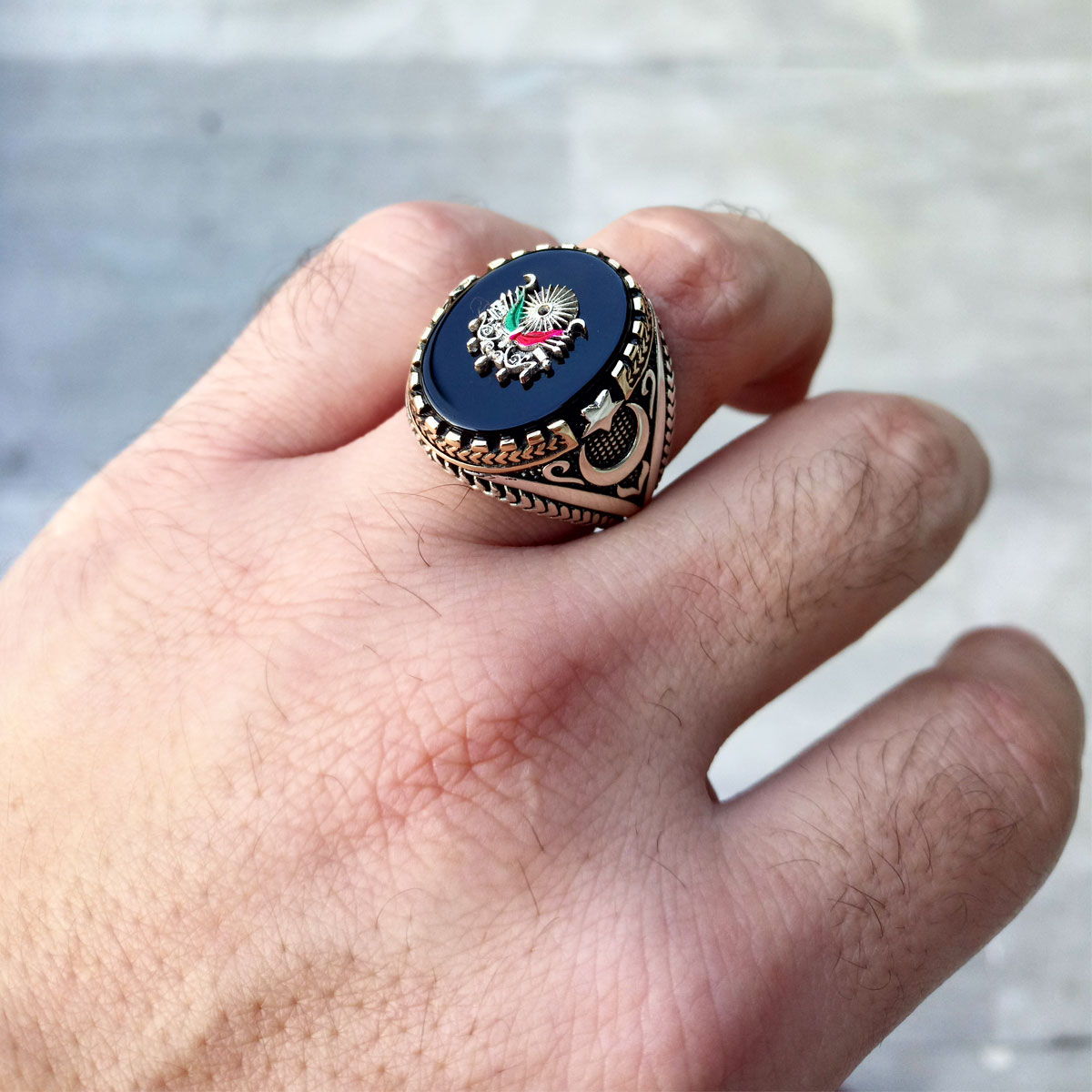 925 Ayar Gümüş Siyah Taşlı Osmanlı Arması İşlemeli Erkek Yüzük