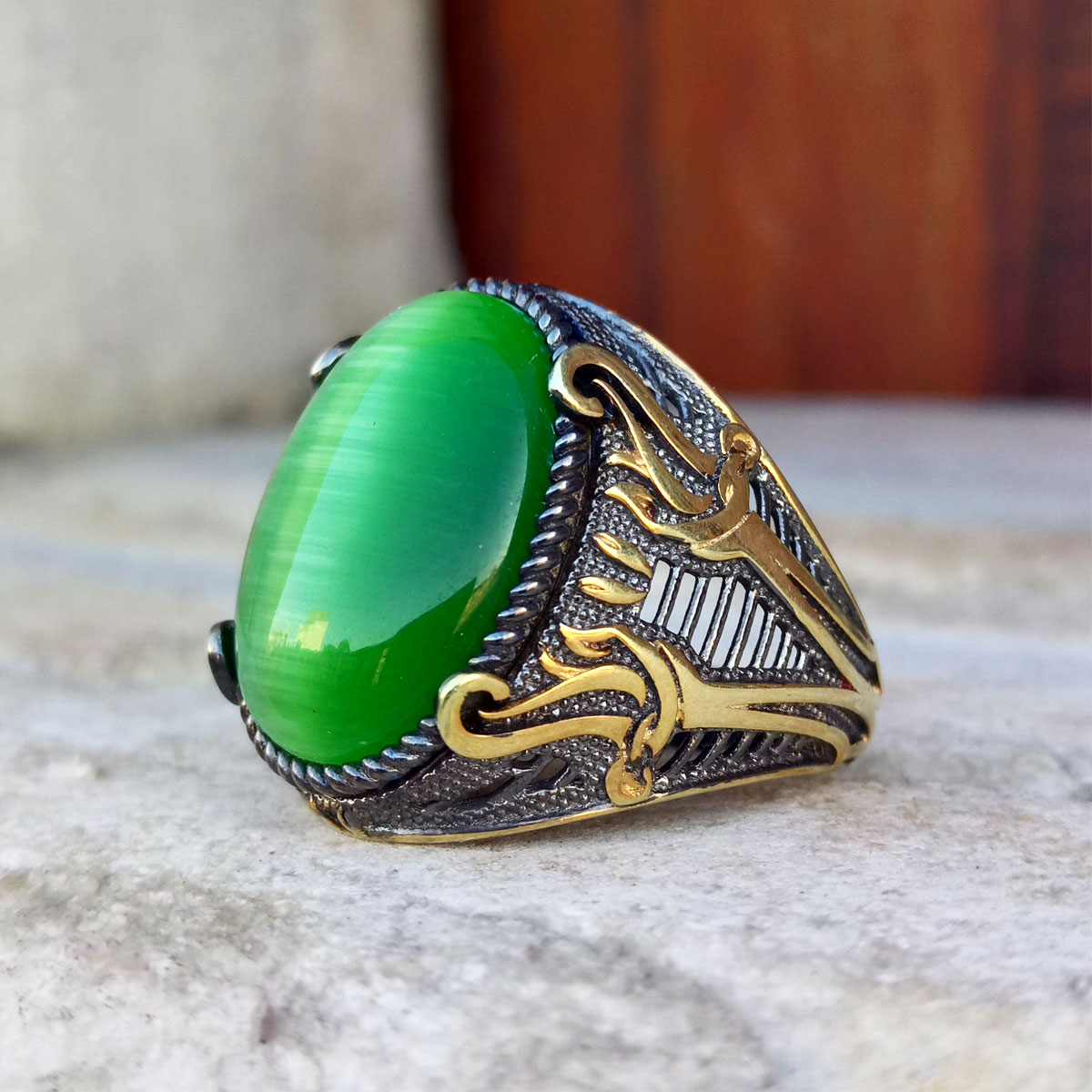 925 Ayar Gümüş Yeşil Kedi Gözü Taşlı Kılıç Motifli Erkek Yüzük