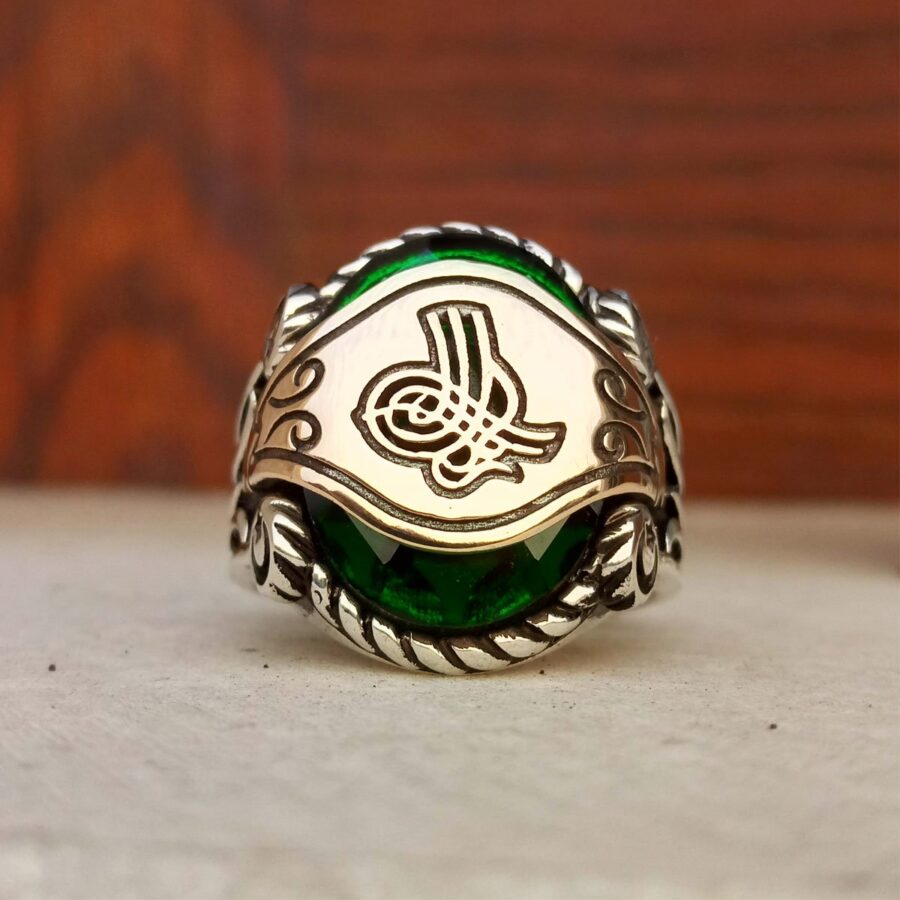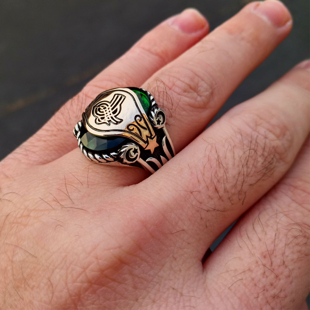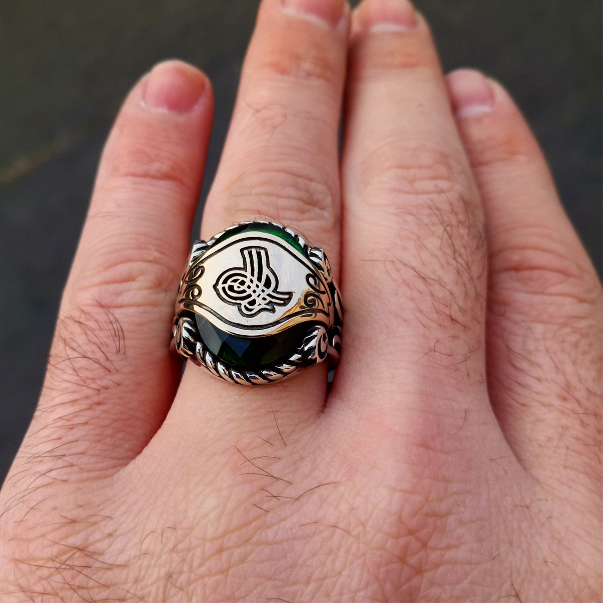925 Ayar Gümüş Yeşil Taşlı Osmanlı Tuğrası Erkek Yüzük