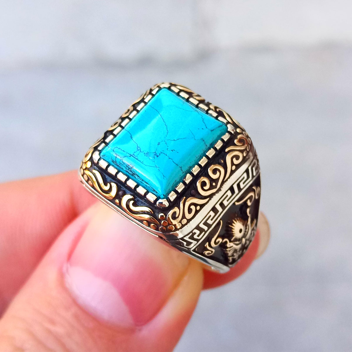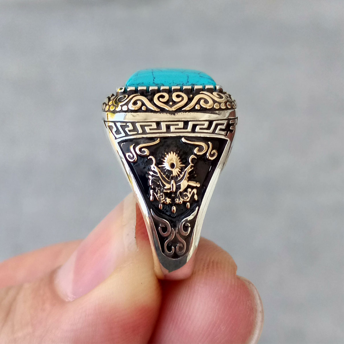 Firuze Siyah Mavi Taşlı Osmanlı Arması Motifli Gümüş Erkek Yüzük