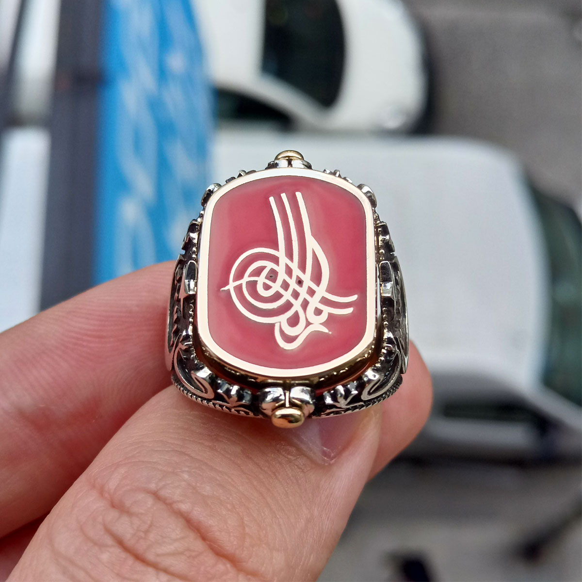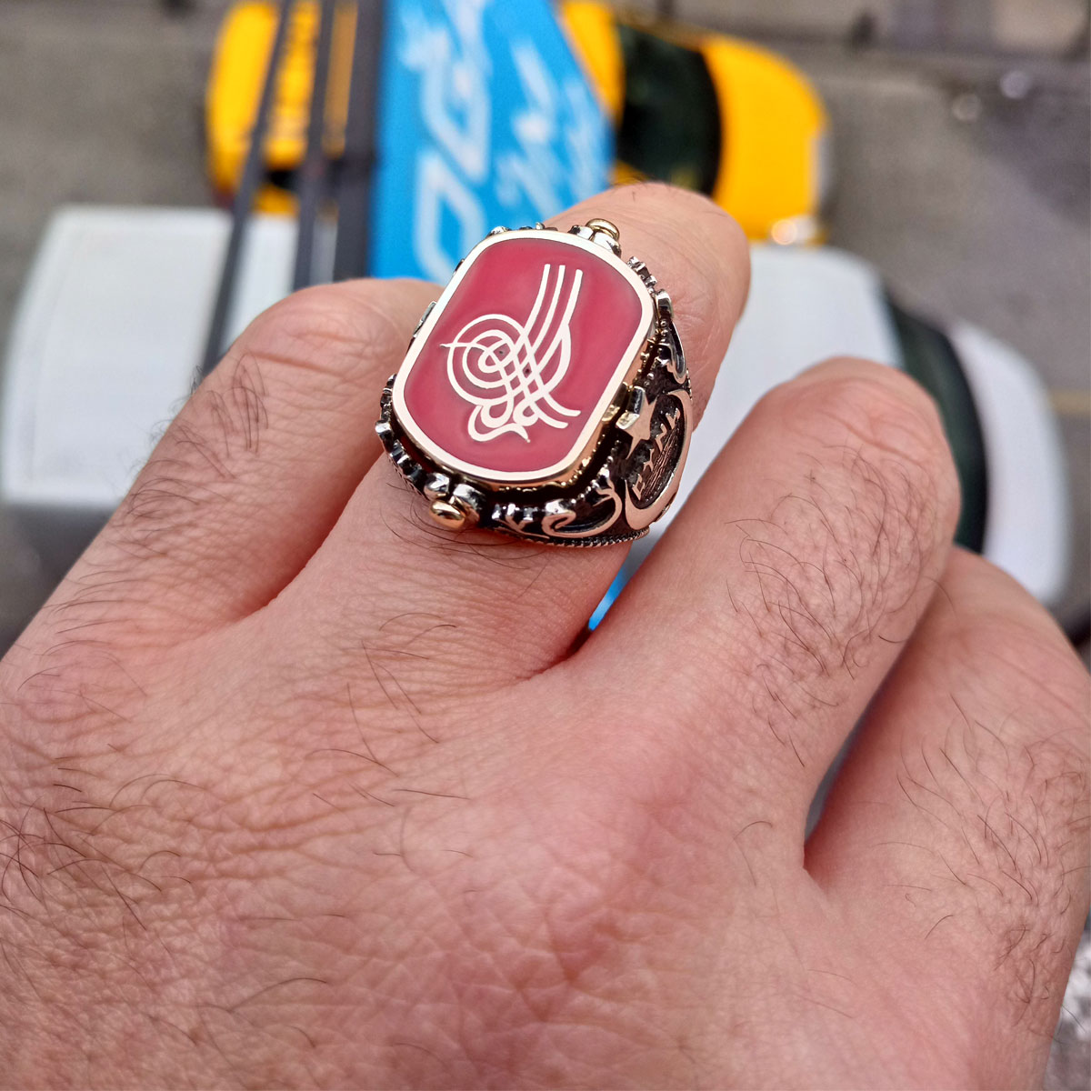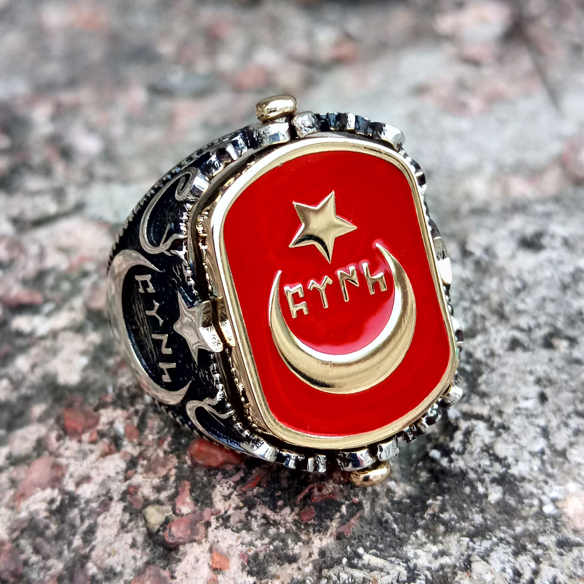 Gümüş Ay Yıldız ve Osmanlı Tuğralı Göktürkçe Yazılı Erkek Yüzük