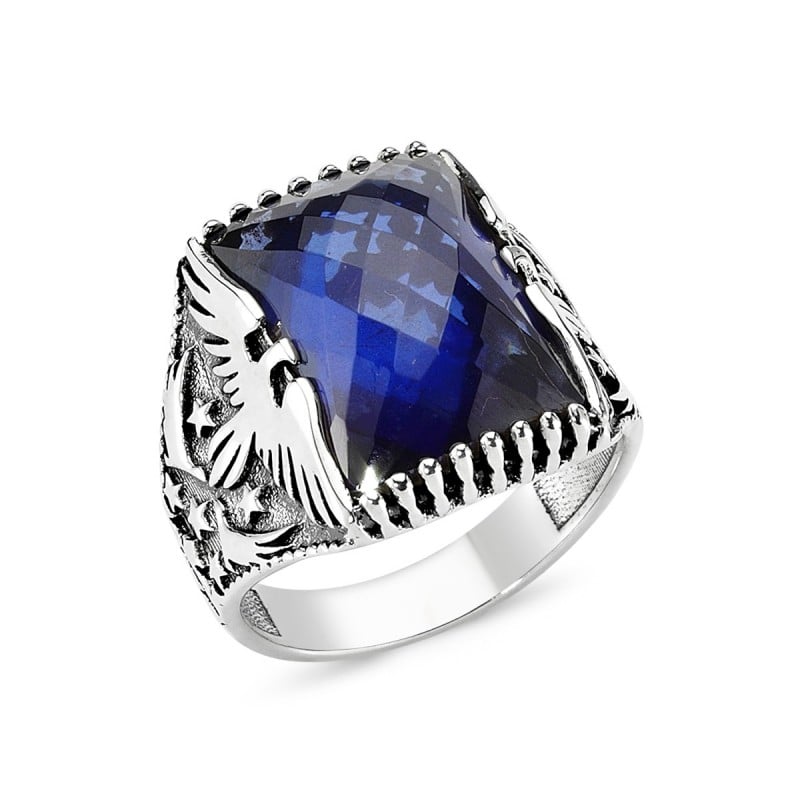 Kartal İşlemeli Mavi Taşlı Erkek Gümüş Yüzük