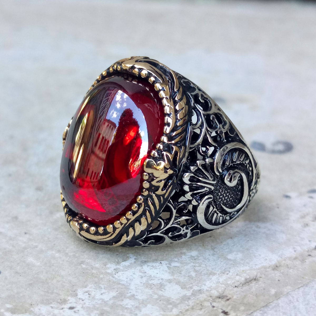 Kırmızı Zirkon Taşlı Vav Desenli Gümüş Yüzük