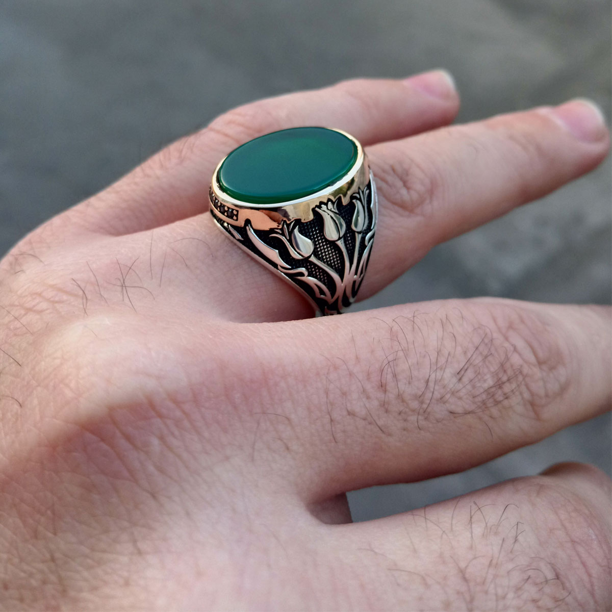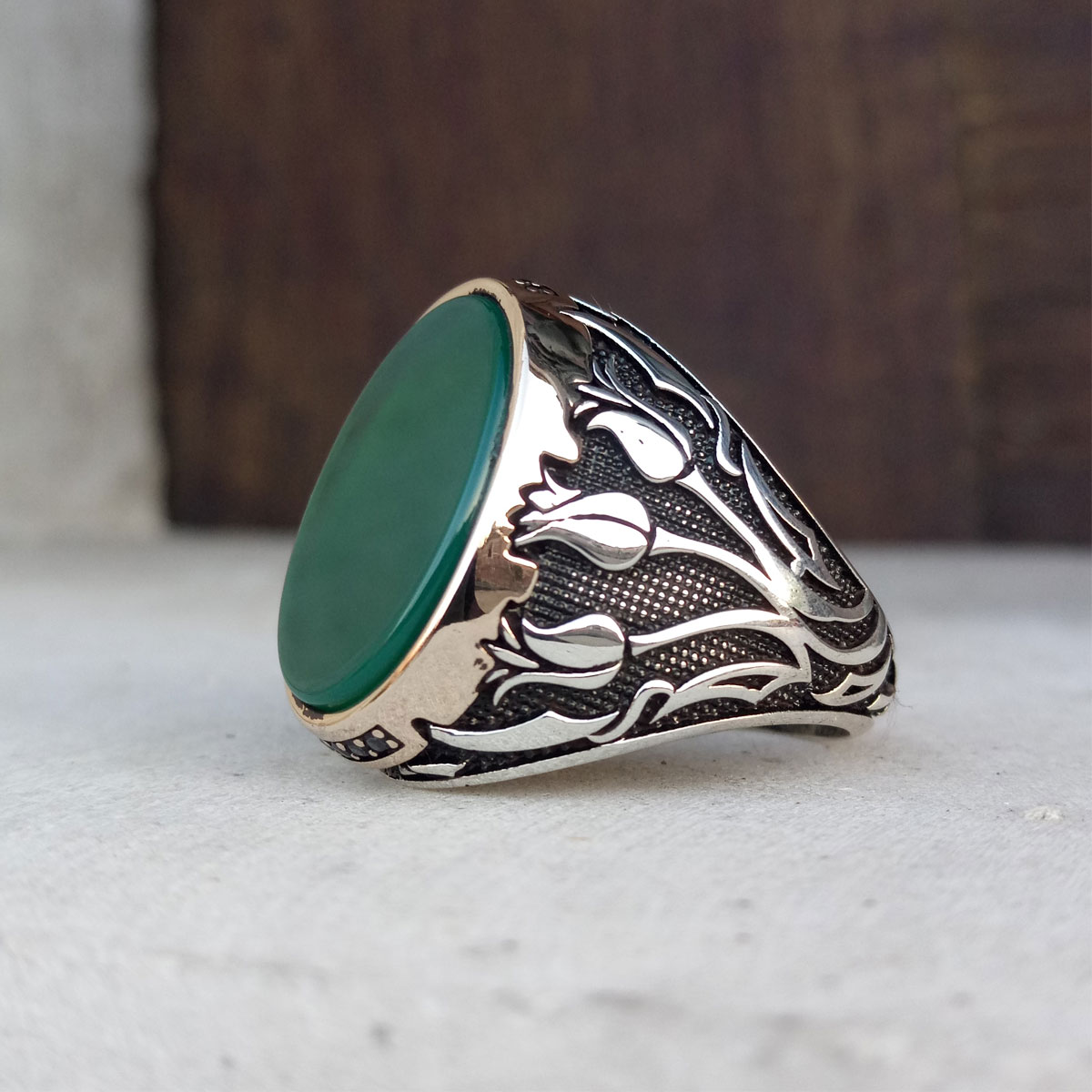 Lale Motifli Yeşil Taşlı Erkek Gümüş Yüzük