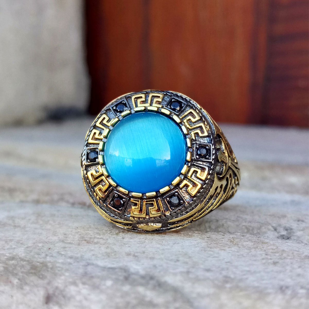 Mavi Kedi Gözü ve Mikro Taşlı Motifli Gümüş Erkek Yüzük