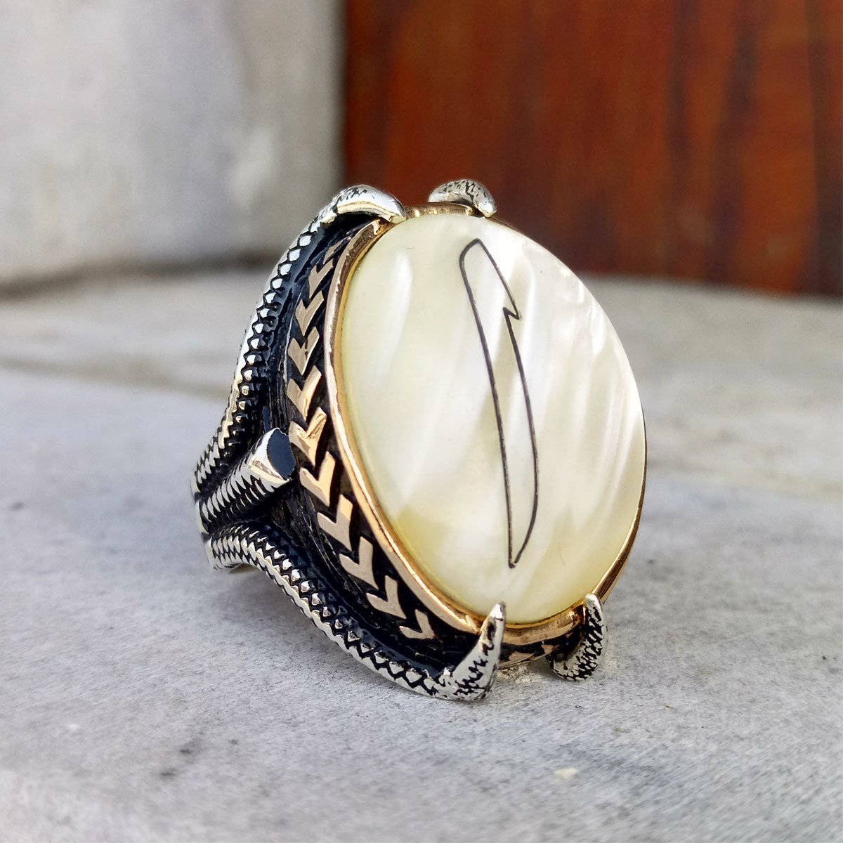 Sedef Taşlı Elif İşlemeli Kartal Pençesi Gümüş Erkek Yüzük