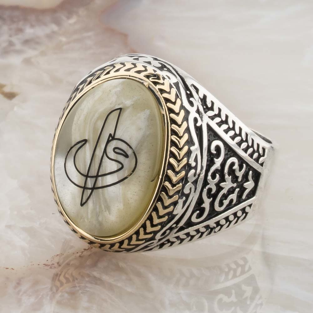 Sedef Taşlı Elif Vav İşlemeli Gümüş Erkek Yüzük Hediyelik