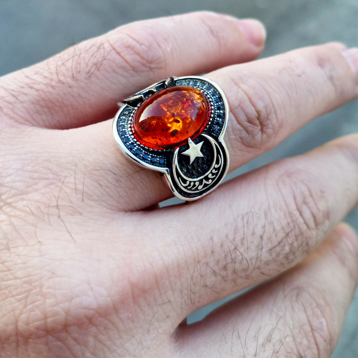 Sıkma Kehribar Ay Yıldız İşlemeli Gümüş Erkek Yüzük