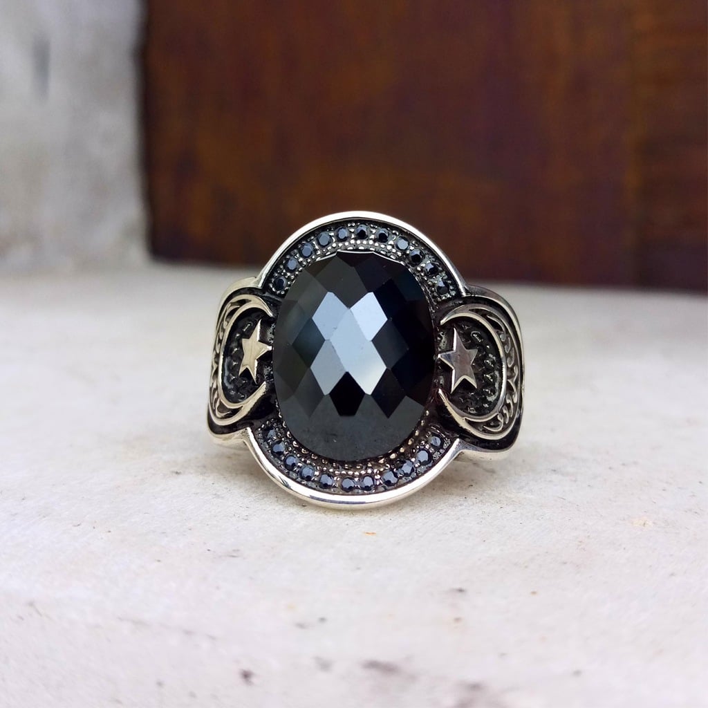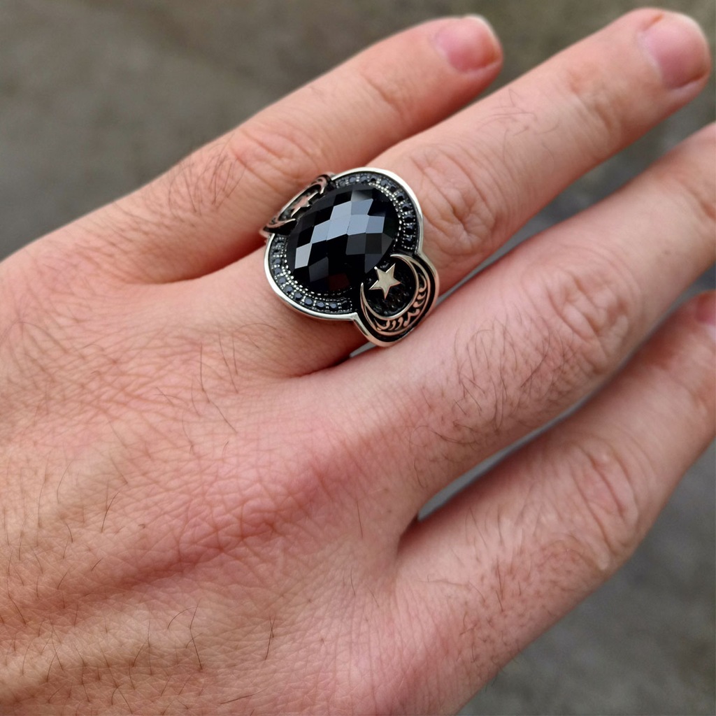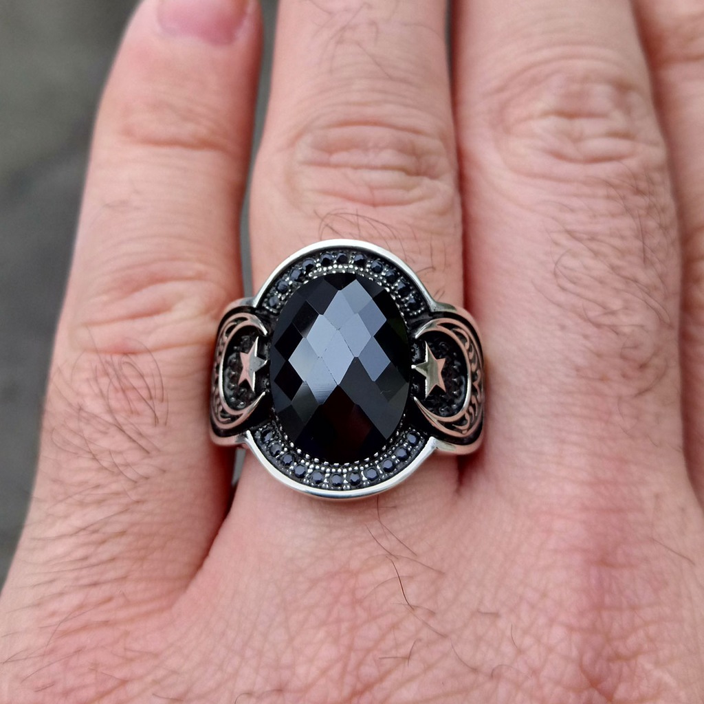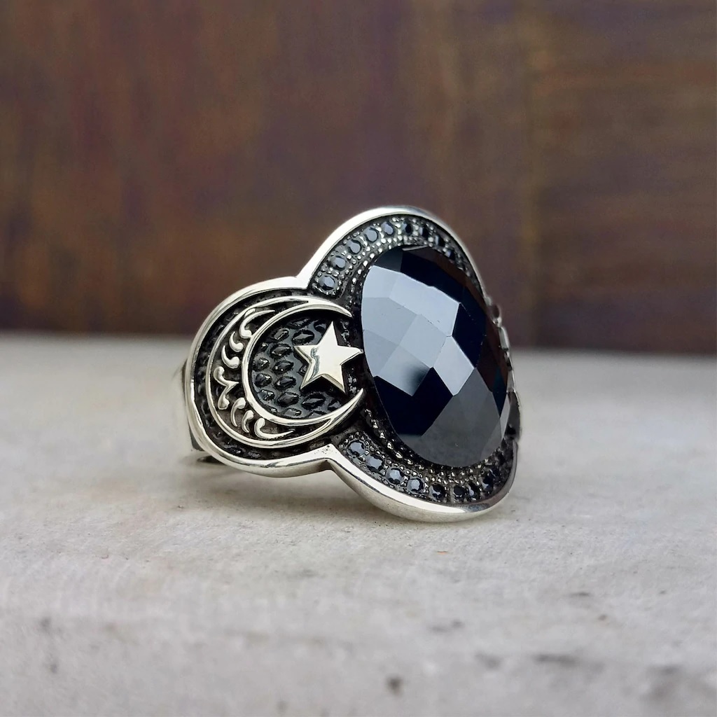 Siyah Zirkon Taşlı 2 Ay Yıldızlı Gümüş Erkek Yüzük
